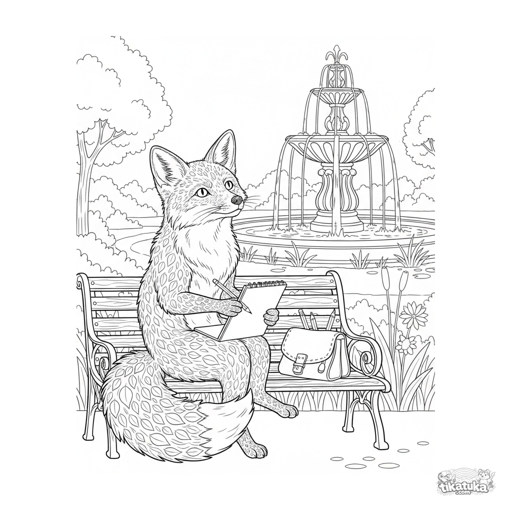 Detailliertes Ausmalbild für Kinder von 10-12 Jahren: Ein realistischer Fuchs sitzt auf einer Parkbank und zeichnet eine Landschaft.