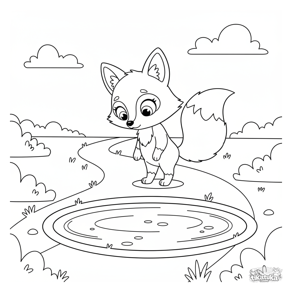 Füchsin Foxy steht neugierig vor einer riesigen Pfütze. Jetzt herunterladen, ausdrucken oder online ausmalen!
