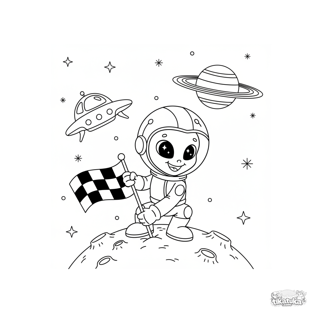 Ausmalbild für Kinder 4-6: Ein süßes Alien im Raumanzug pflanzt eine Flagge auf einen Mondkrater. Weltraum-Erkundungsszene.