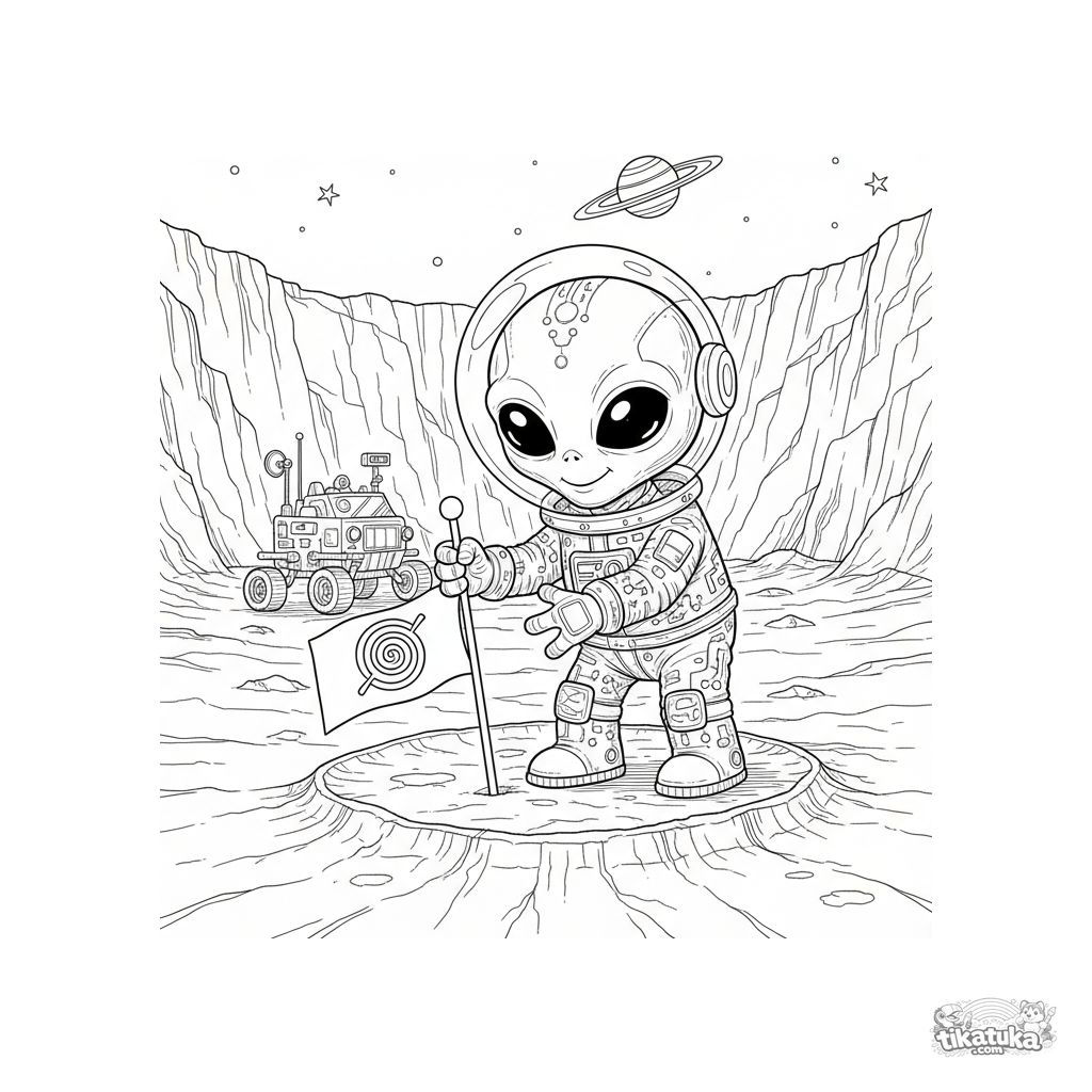 Schwieriges Ausmalbild für Kinder 8-12: Ein freundlicher Alien pflanzt eine Flagge auf einer Mondkrateroberfläche. Hohe Detailgenauigkeit, realistischer Stil.