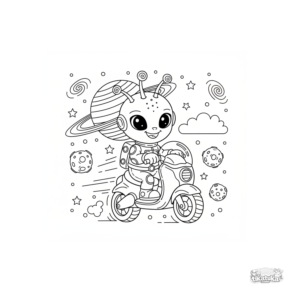 Lustiges Weltraum-Ausmalbild für Kinder 4-6: Ein freundliches Alien fährt auf einem schwebenden Scooter an einem Ringplaneten vorbei. Einfache Umrisse.