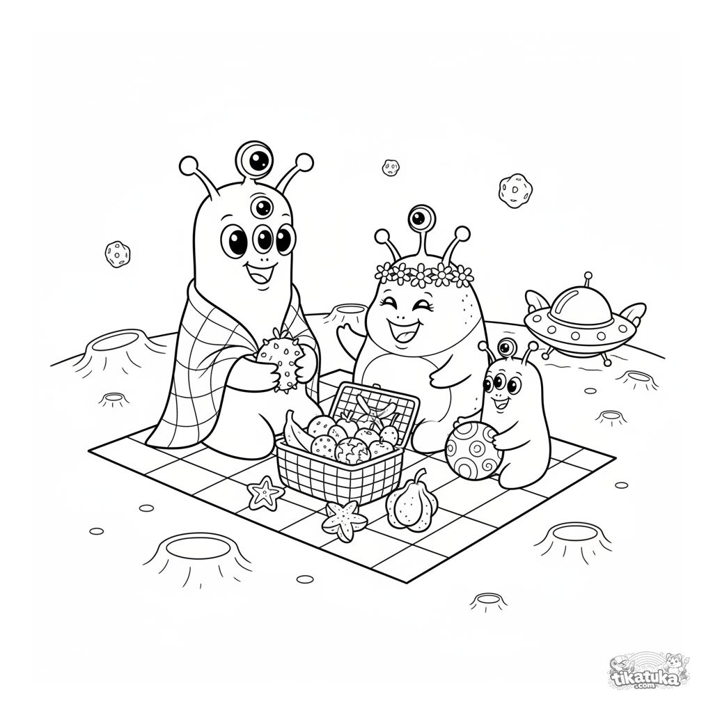Ausmalbild für Kinder 4-6: Eine freundliche Alien-Familie macht ein Picknick auf der Mondoberfläche. Lustige Weltraumszene mit fliegender Untertasse.
