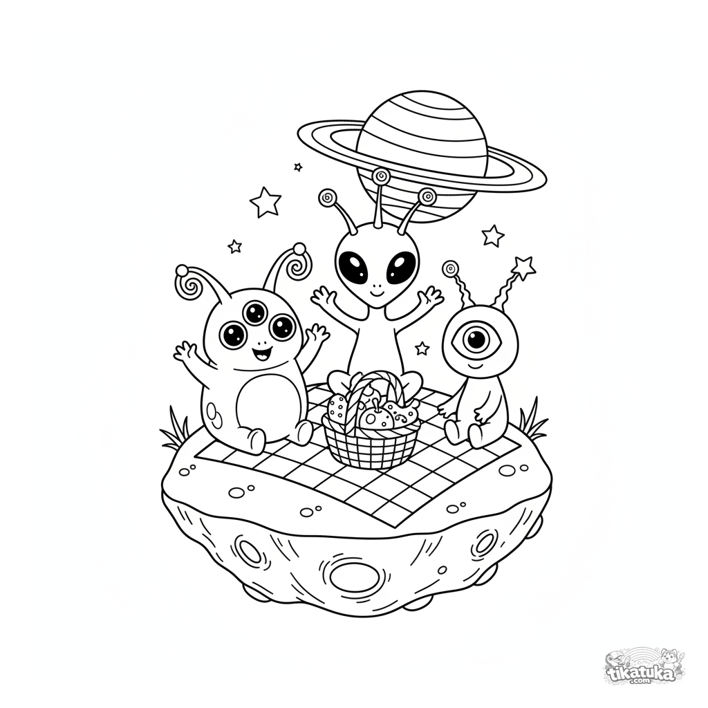 Ausmalbild für Kinder: Eine freundliche Alien-Familie picknickt auf einem schwebenden Asteroiden im Weltraum. Eine lustige Szene mit mäßigem Detail für 4-6 Jahre.