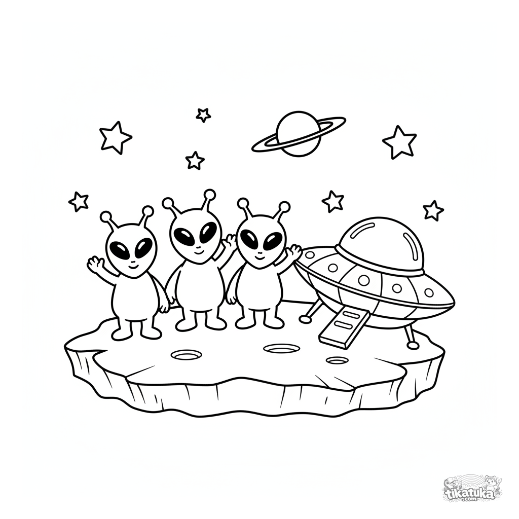 Ausmalbild für Kleinkinder von 2-3 Jahren mit einer freundlichen Alien-Familie. Sie stehen neben ihrem Unterteller auf einem Asteroiden und winken. Sehr einfache Umrisse.