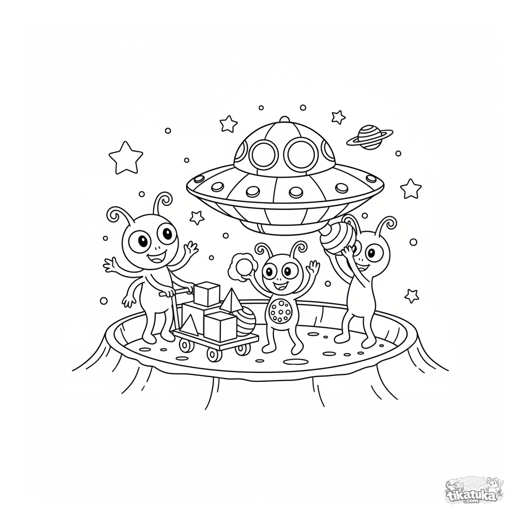 Ausmalbild einer freundlichen Alien-Familie, die ihr Untertassenschiff in einem Mondkrater entlädt. Für Kinder von 4 bis 6 Jahren.