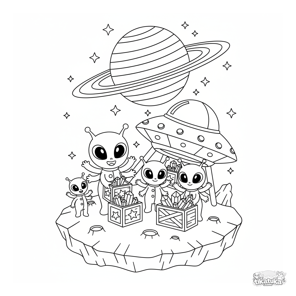 Ausmalbild für Kinder 4-6 zum Thema Weltraum: Eine Familie freundlicher Aliens lädt Kristalle auf einem Asteroiden vor einem Ringplaneten ab. Fantastische Szene.