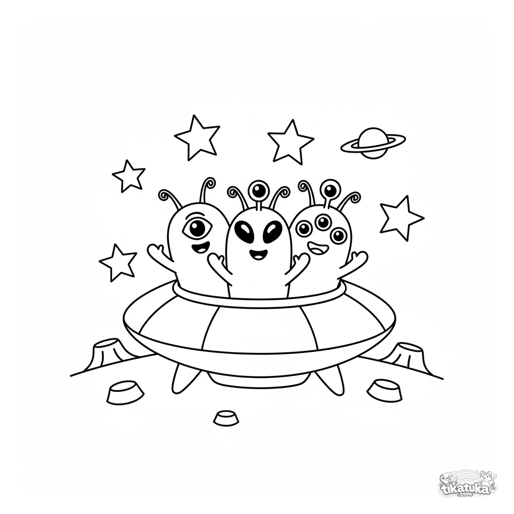 Einfaches Ausmalbild für Kleinkinder 2-3: Eine freundliche Alien-Familie winkt aus ihrem ovalen Raumschiff. Große Formen, wenig Details, perfekt für die Jüngsten.