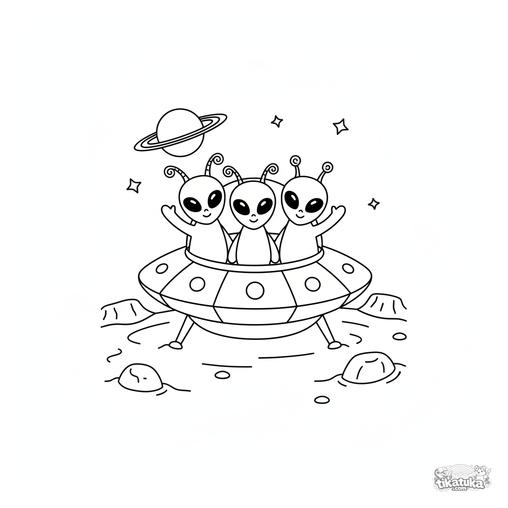 Kleinkind-Ausmalbild. Eine freundliche Alien-Familie winkt aus ihrem UFO auf einem anderen Planeten. Sehr einfache Umrisse für 2-3 Jahre.