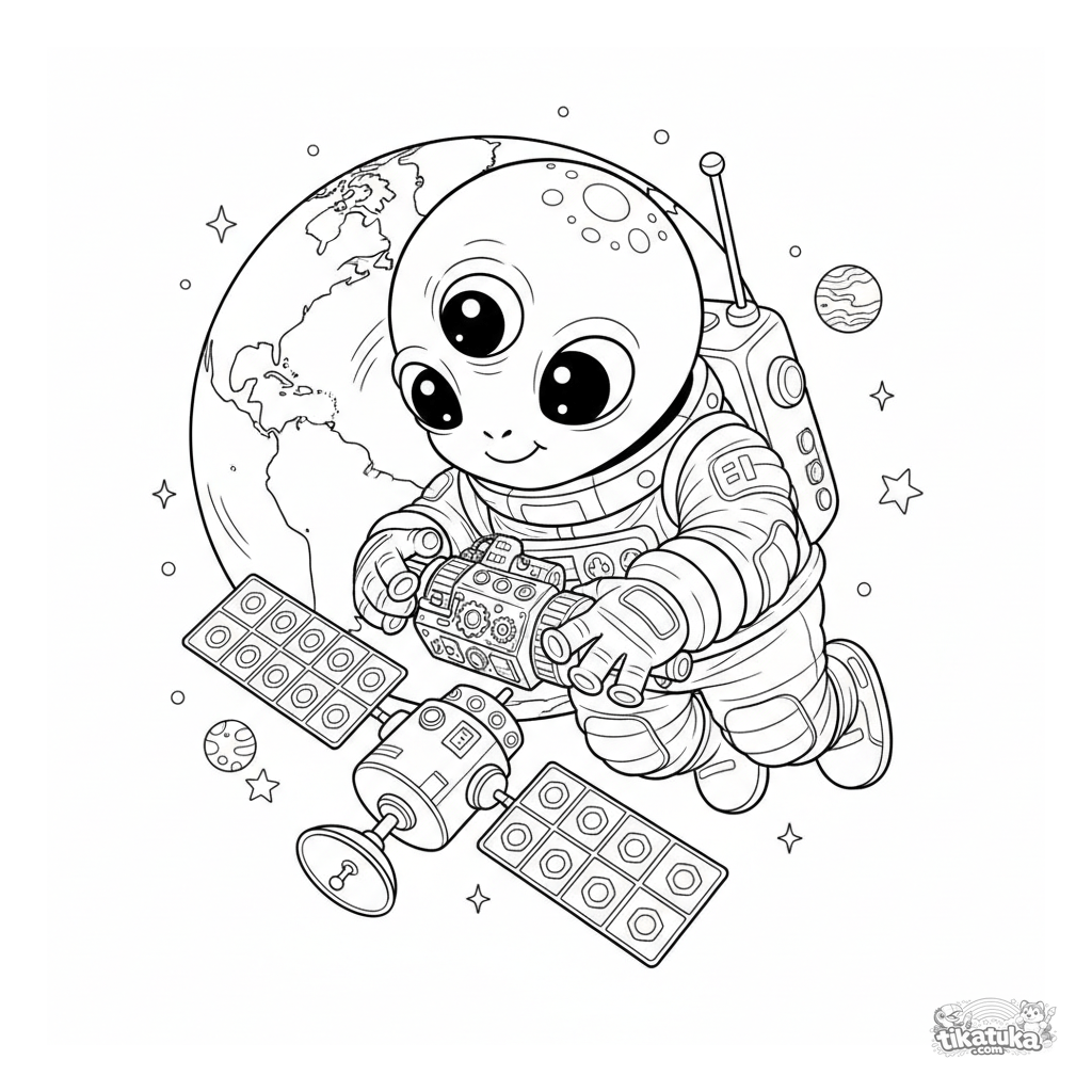 Detailliertes Weltraum-Ausmalbild: Ein freundlicher Alien mit drei Augen repariert einen Satelliten im Orbit. Viele Details für Kinder von 7-12 Jahren.