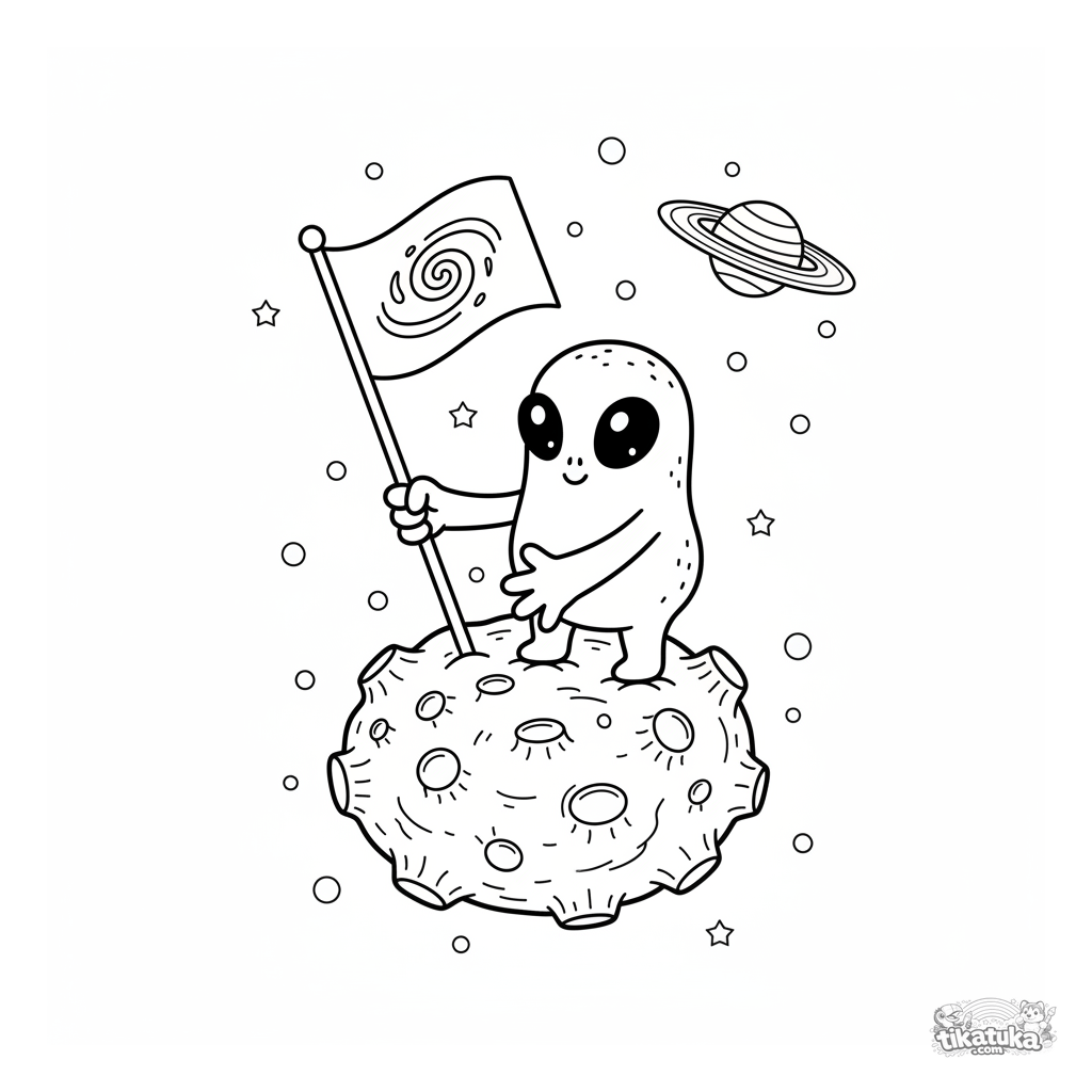 Weltraum-Ausmalbild für Kinder von 4-6 Jahren: Ein freundliches Alien pflanzt eine Flagge auf einen kleinen Asteroiden. Einfache Formen und eine lustige Geschichte sind ideal für eine erste Einführung in den Weltraum.