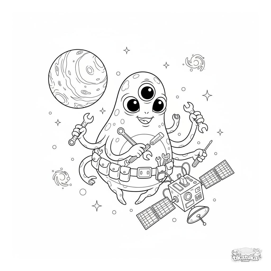 Detailliertes, realistisches Weltraum-Ausmalbild für ältere Kinder 7-12: Ein freundliches Alien mit Tentakeln repariert einen Satelliten im Orbit. Eine komplexe Szene mit Planeten.