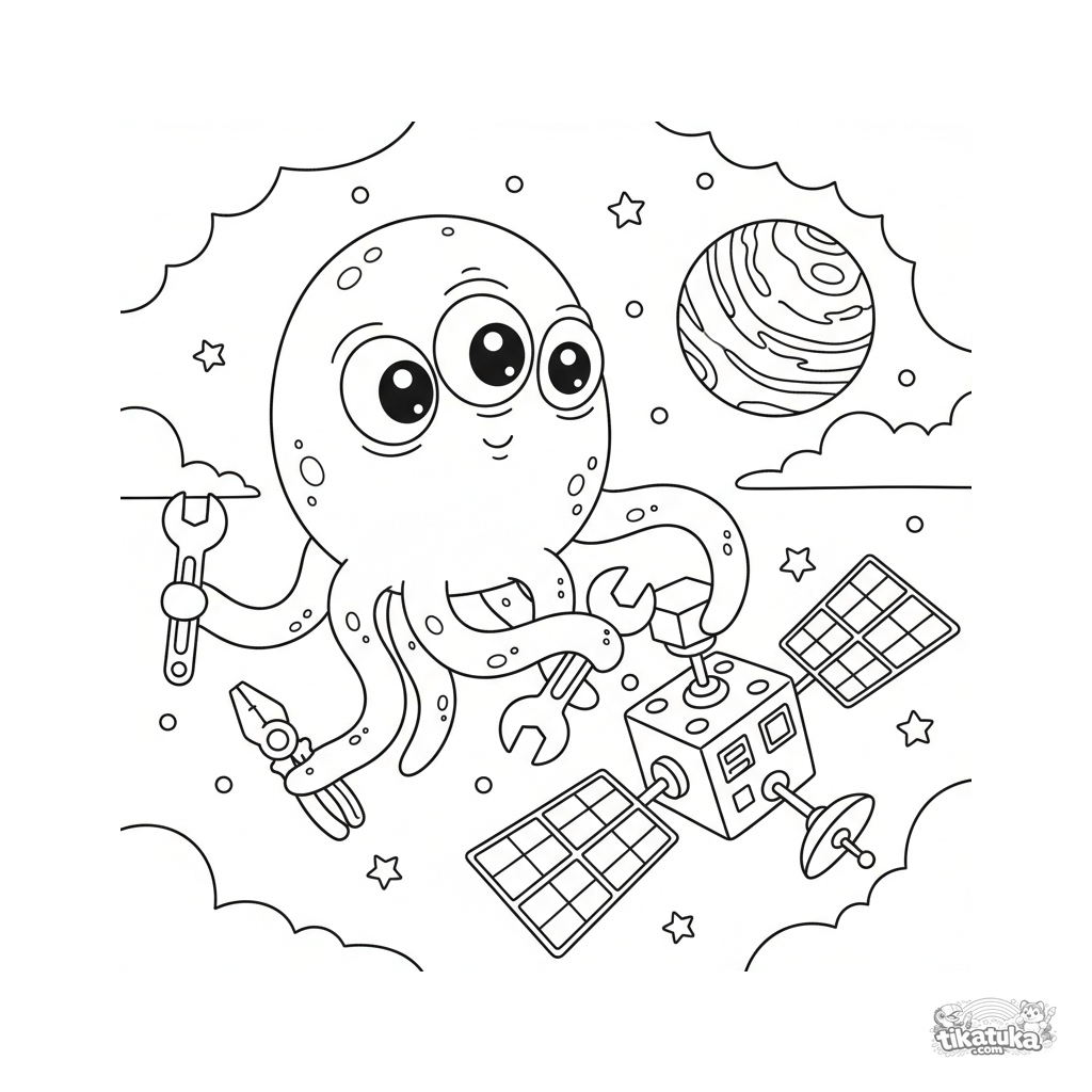Ausmalbild für ältere Kinder 7-12: Ein freundliches Alien mit Tentakeln repariert einen Satelliten im Weltraum. Detaillierte Szene.