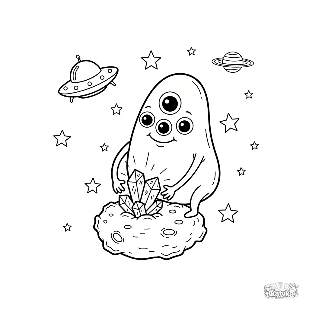 Weltraum-thematisches Ausmalbild für Kinder 4-6: Ein süßer Alien mit mehreren Augen sammelt glänzende Kristalle auf einem Asteroiden. Einfacher Sternenhintergrund.