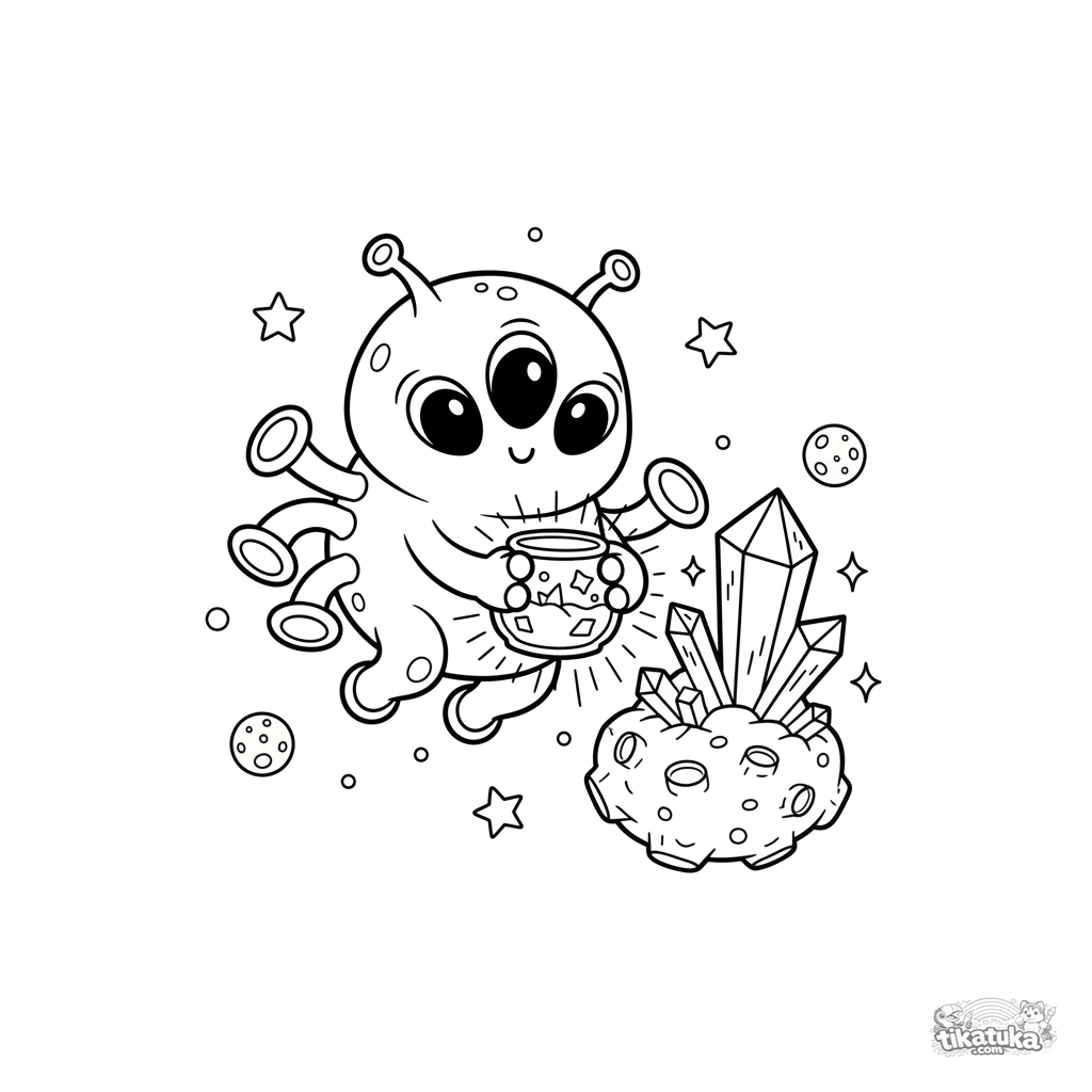 Ausmalbild für Kinder 4-6 mit Weltraumthema: ein freundliches Alien sammelt funkelnde Kristalle auf einem Asteroiden. Eine fantastische Szene zum Ausmalen.