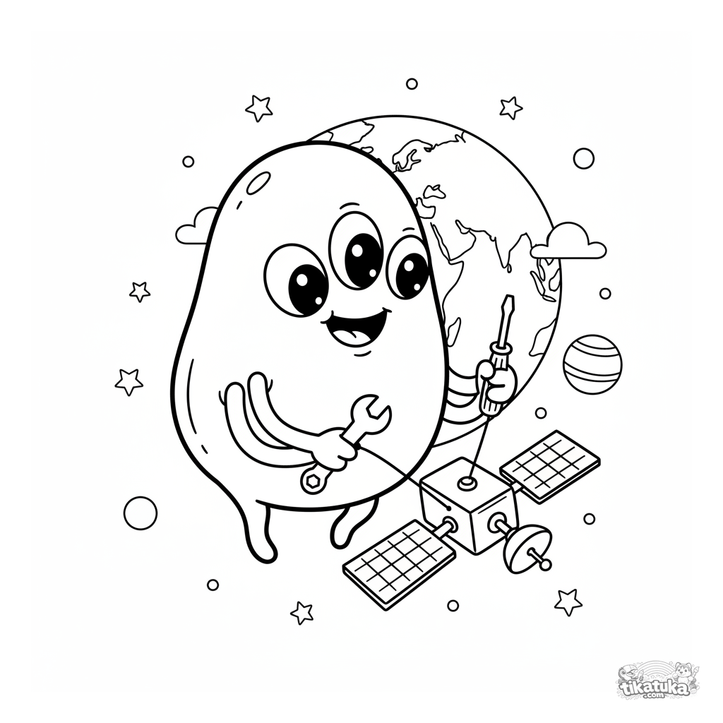 Ausmalbild eines freundlichen Aliens, der einen Satelliten repariert, während er im Orbit um die Erde schwebt. Für Kinder von 4 bis 6 Jahren.