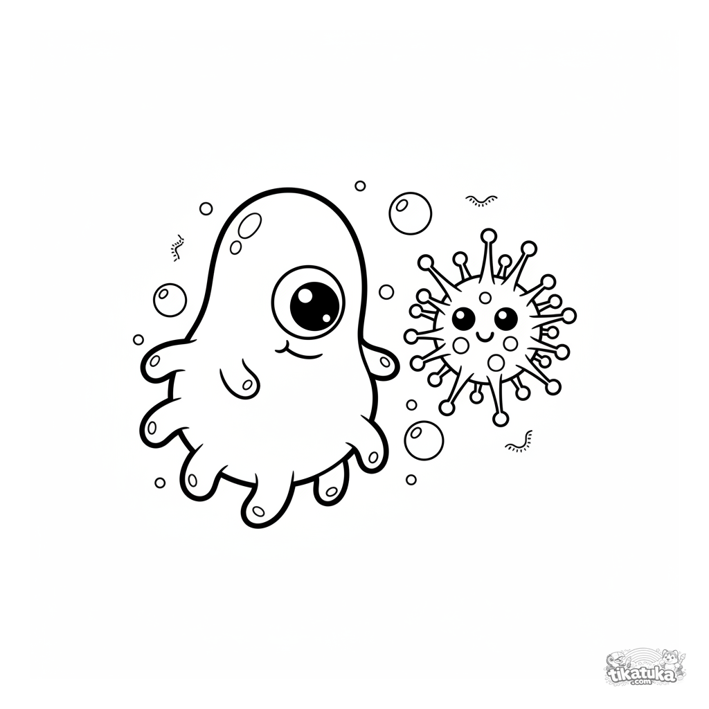 Ausmalbild für Kinder: Ein freundliches Amöben-Mikrobe schwebt nahe einem Cartoon-Virus. Für 4-6 Jahre.