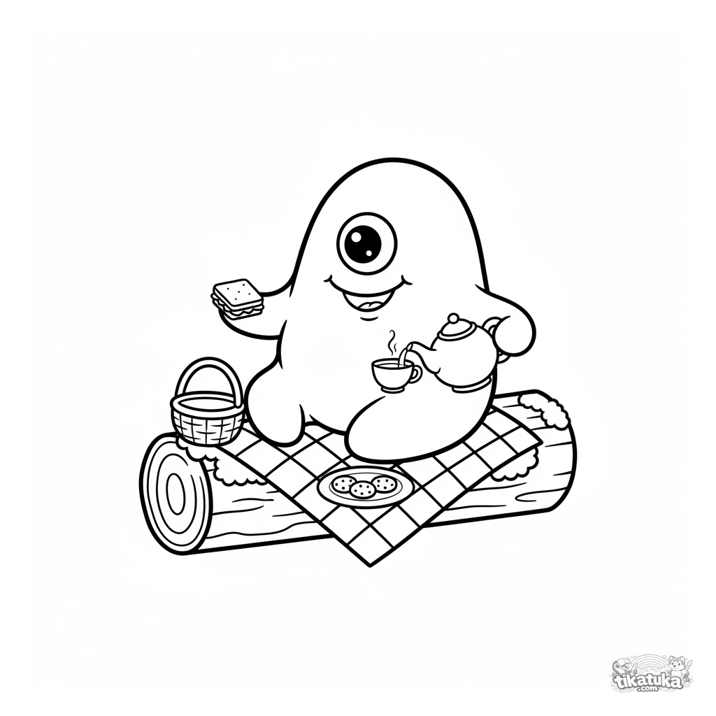 Einfaches und niedliches Ausmalbild für Kleinkinder: Eine freundliche Amöben-Mikrobe macht Picknick auf einem moosigen Baumstamm. Große Details, dicke Umrisse.