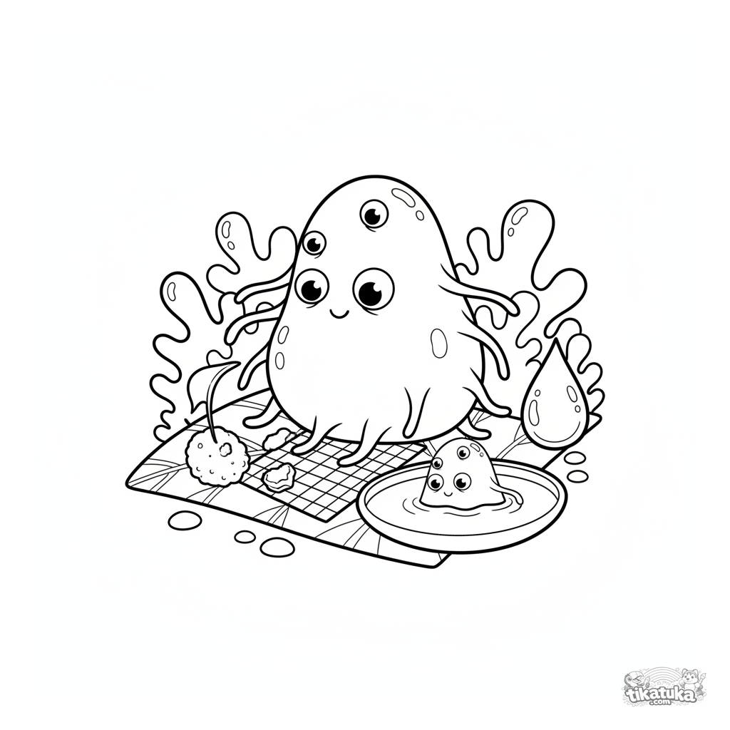 Lustiges Ausmalbild einer freundlichen Cartoon-Amöbe, die ein winziges Picknick auf einem Blatt macht. Für Kinder von 5-8 Jahren.