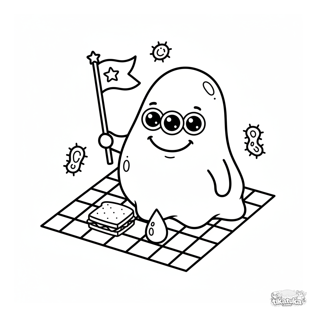 Lustiges Ausmalbild für Kleinkinder: Eine freundliche Amöbe macht ein Picknick. Für 2-5 Jahre. Einfache, große Formen.