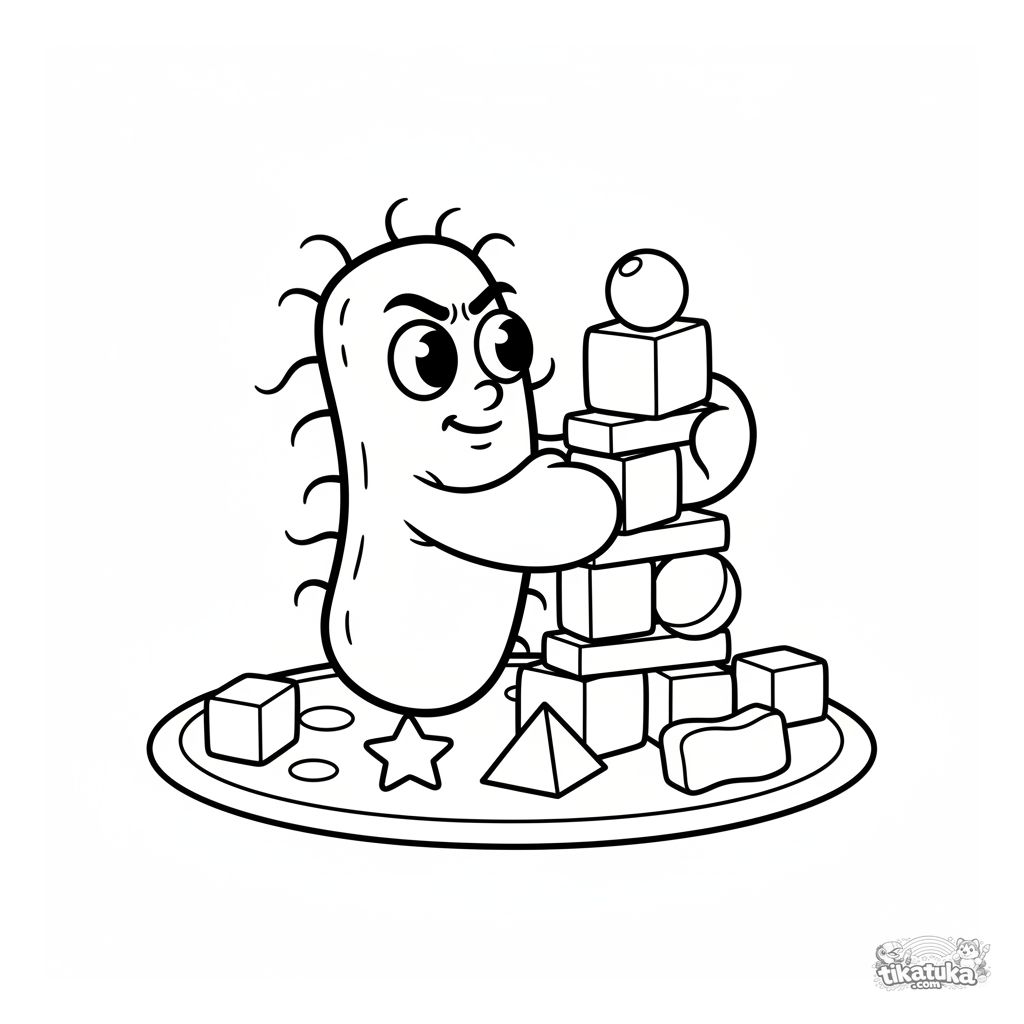 Einfaches, süßes Ausmalbild für Kleinkinder von 2-5 Jahren: Ein freundliches stäbchenförmiges Bakterium baut einen Turm aus klebrigen Bausteinen. Große Formen.