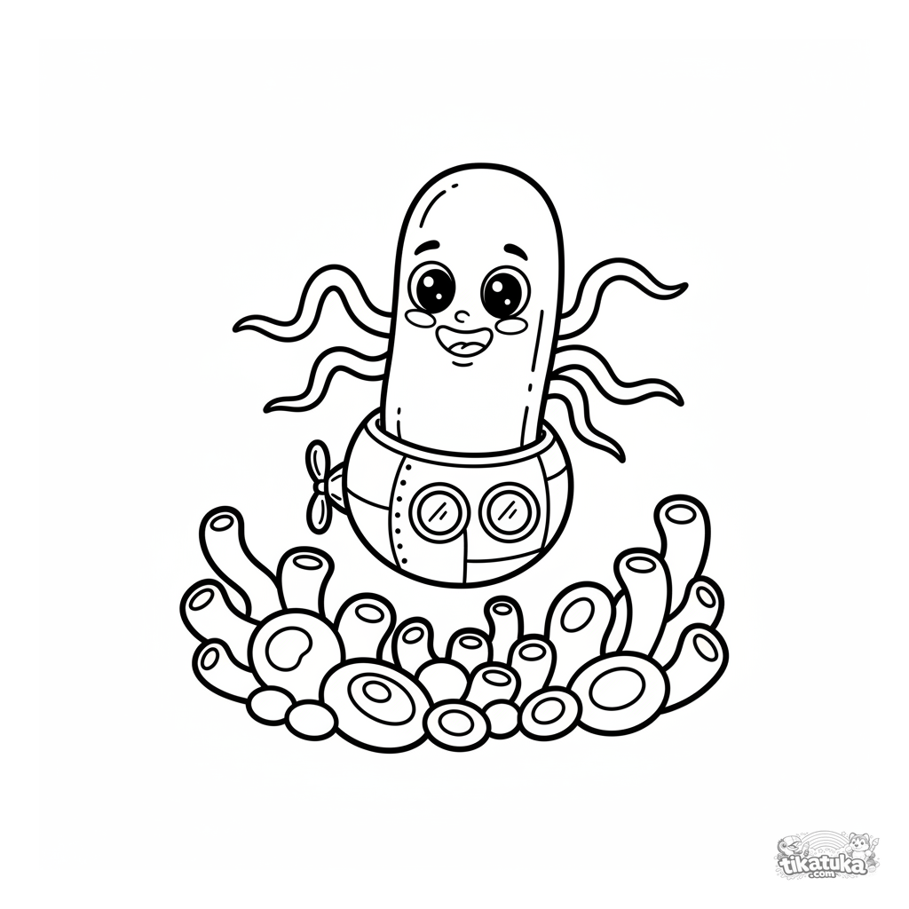 Einfaches Ausmalbild für Kleinkinder von 2-3 Jahren mit einem freundlichen Bakterium in einem U-Boot. Große Formen, wenige Details, breite Ränder.