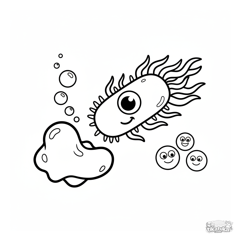 Ein Ausmalbild zum Thema Mikroben mit Detailgrad Einfach. Es passt für das Alter 2-3 Jahre, lässt sich gut zu Hause drucken und sofort online öffnen.