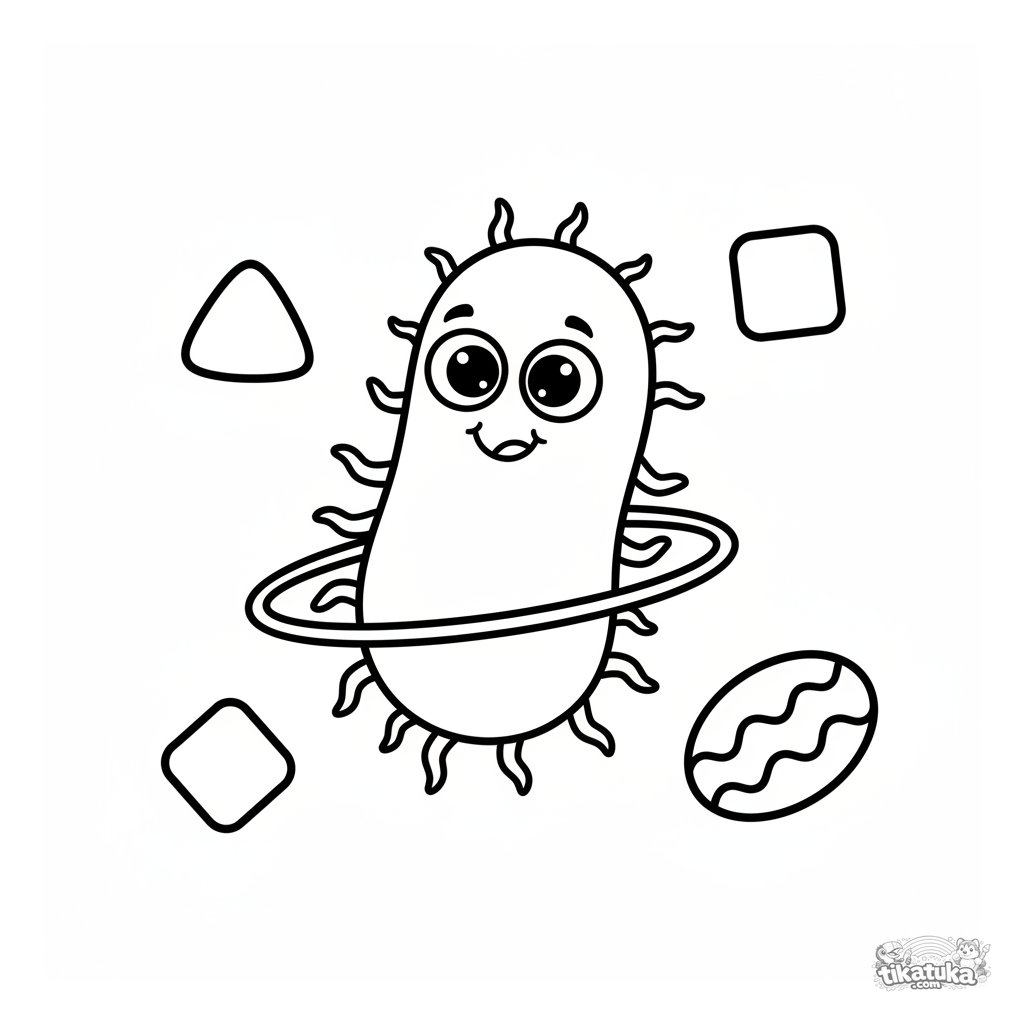 Ein sehr einfaches Ausmalbild für Kleinkinder von 2-3 Jahren: ein freundliches Bakterium dreht einen Hula-Hoop-Reifen. Große Formen, dicke Umrisse.