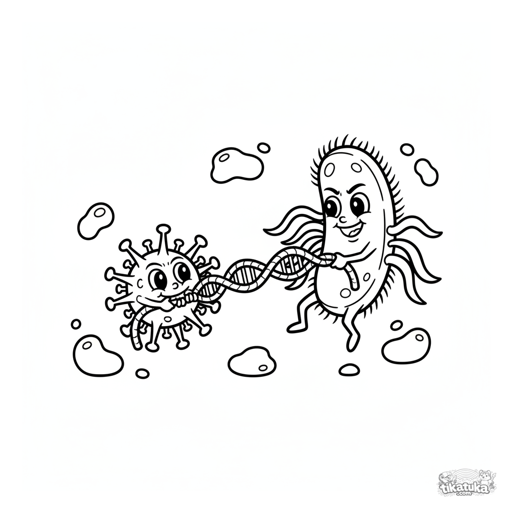 Lustiges und einfaches Ausmalbild für Kleinkinder: ein freundliches Bakterium spielt Tauziehen mit einem Cartoon-Virus. Für Kinder von 2-5 Jahren.