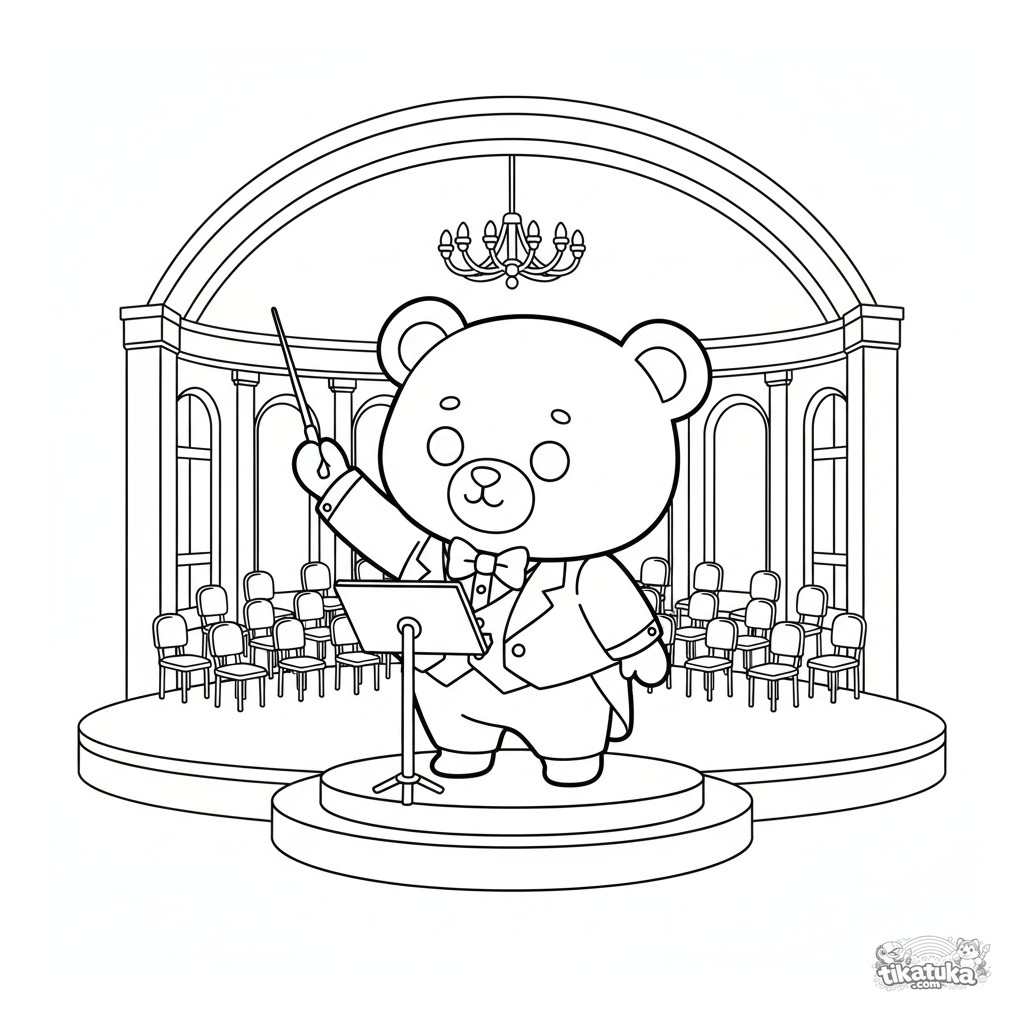 Ausmalbild für Kinder von 4-6 Jahren: Ein Plüschbär im Frack dirigiert ein Orchester auf der großen Bühne einer Konzerthalle.