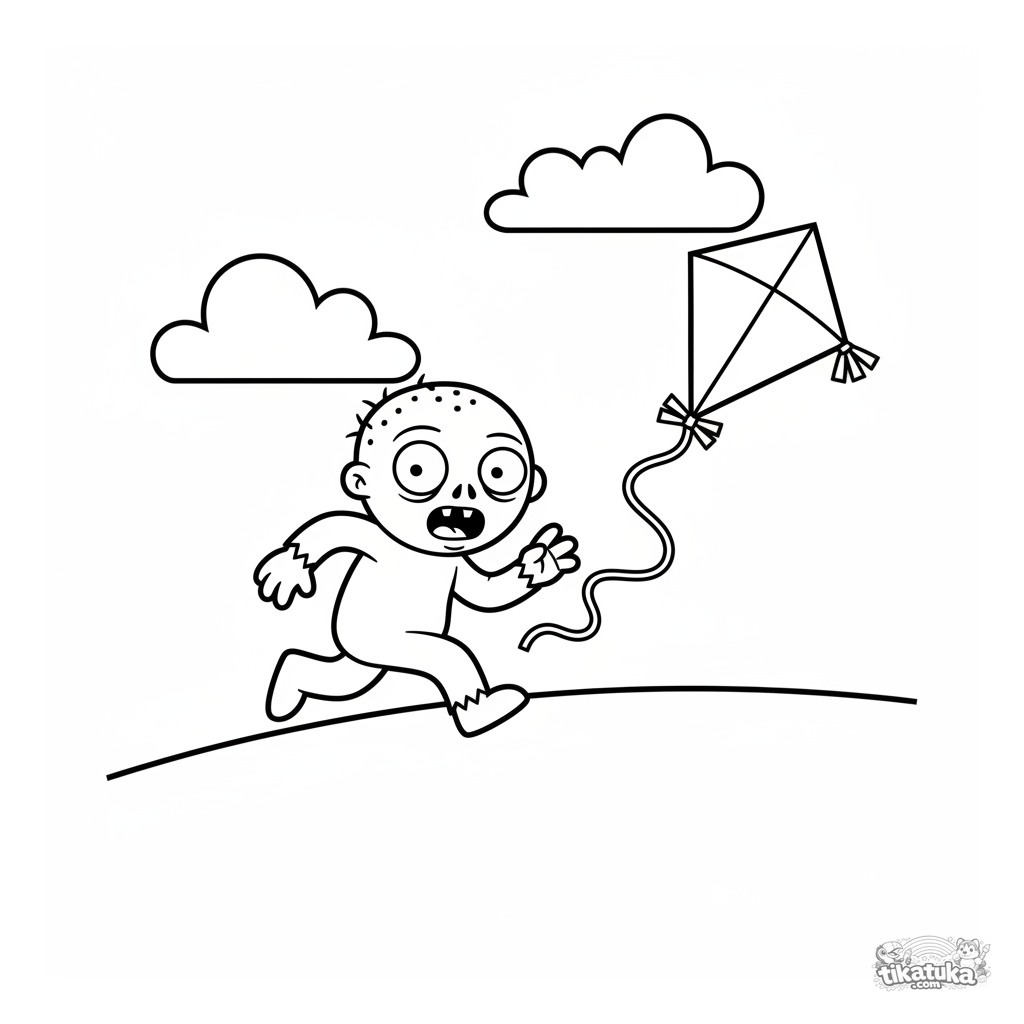 Einfaches Ausmalbild für Kleinkinder von 2-3 Jahren mit einem freundlichen Zombie. Der Zombie läuft einen Hügel hinauf und versucht, einen Drachen steigen zu lassen, die Schnur ist verheddert. Große Formen, wenige Details.