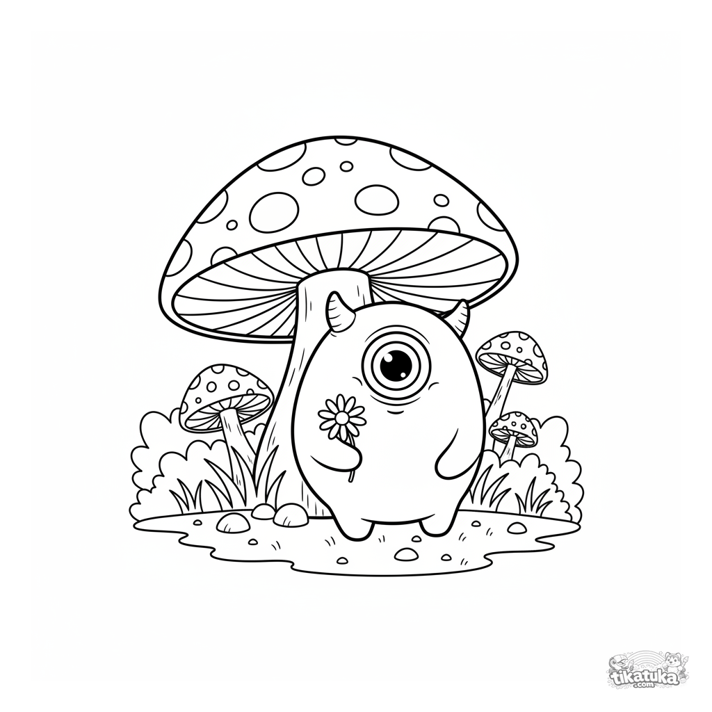 Ausmalbild für Kinder 4-6: Ein freundliches Einäugiges Zyklopen-Monster lugt hinter einem großen Pilz im Wald hervor. Einfache Formen, niedlicher Ausdruck.