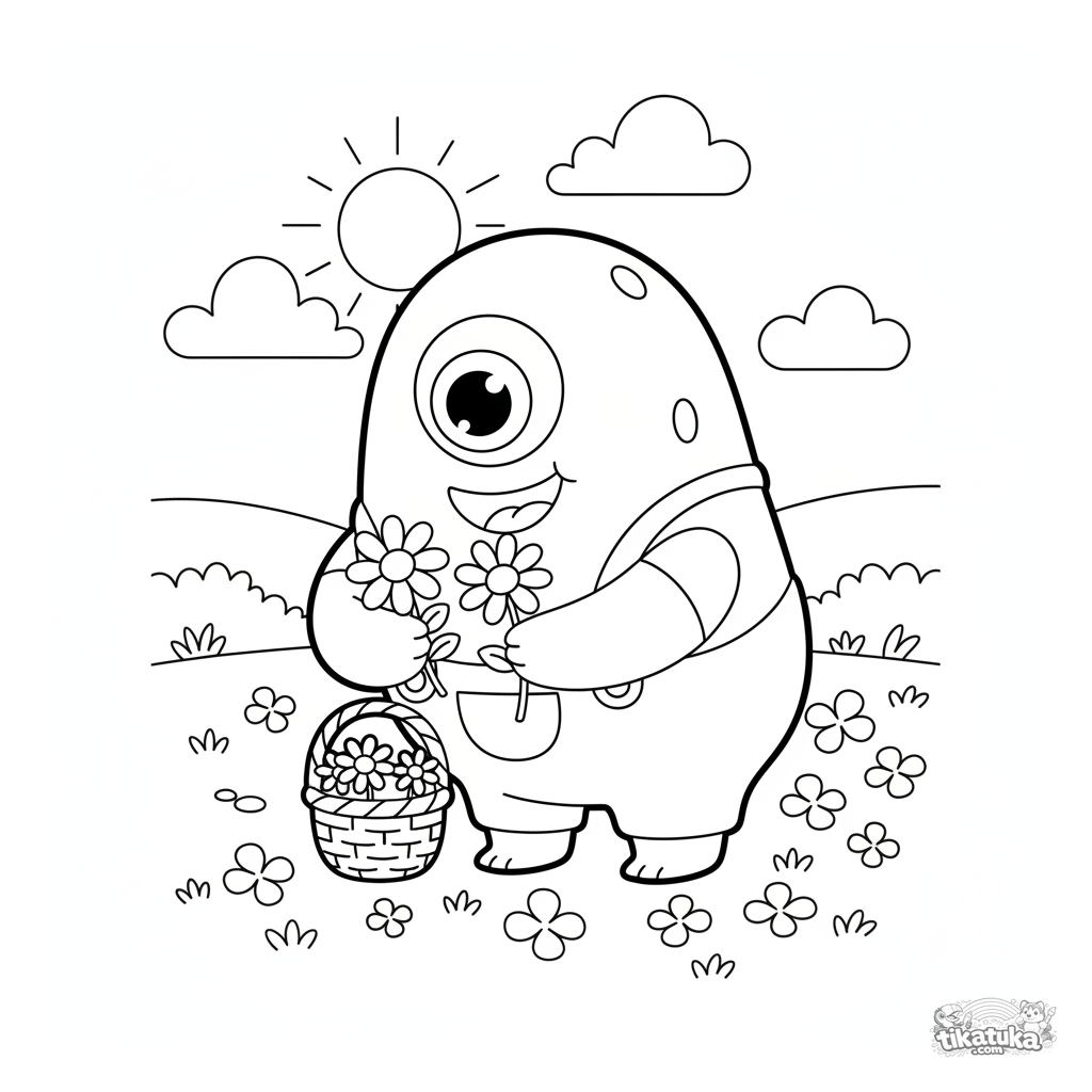 Ausmalbild eines freundlichen Zyklopen, der Gänseblümchen auf einer Wiese pflückt. Für Kinder von 4-6 Jahren. Einfache, niedliche Szene.