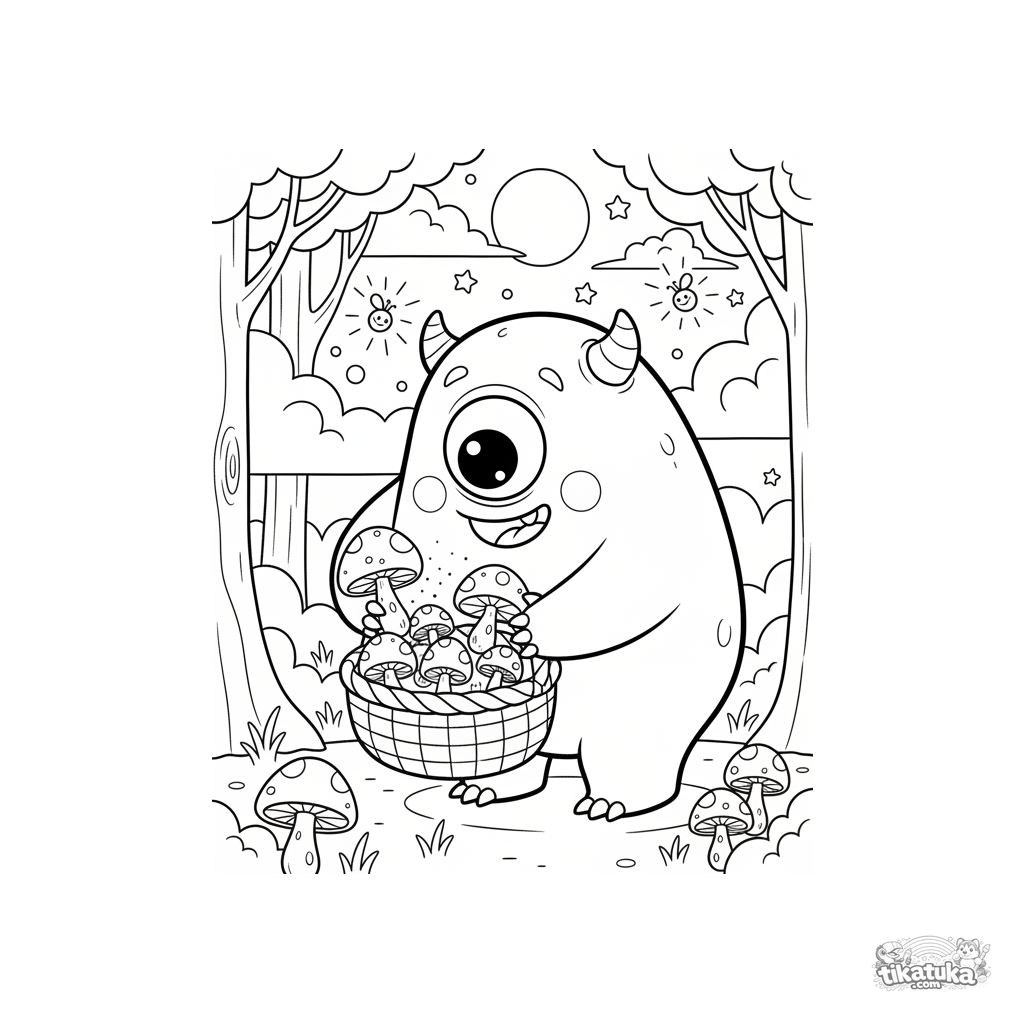 Ausmalbild für Kinder: ein freundlicher Zyklop pflückt leuchtende Pilze in einem verzauberten Wald. Geeignet für Kinder von 4-6 Jahren.