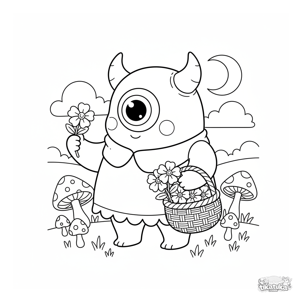 Ausmalbild eines freundlichen Zyklopen in einer Dämmerungswiese. Für Kinder von 4-6 Jahren. Der Zyklop hält einen Korb und pflückt magische Mondblüten zwischen Fliegenpilzen.