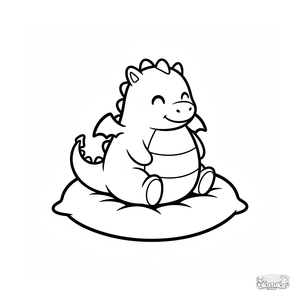 Ausmalbild für Kleinkinder 2-3 Jahre: ein süßer Plüschdrache mit kleinen Flügeln sitzt auf einem flauschigen Kissen. Einfache runde Form.