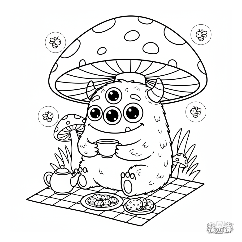 Ausmalbild eines freundlichen, pelzigen Dreiäugigen Monsters, das ein Tee-Picknick unter einem Riesenpilz macht. Für Kinder von 5 bis 8 Jahren.