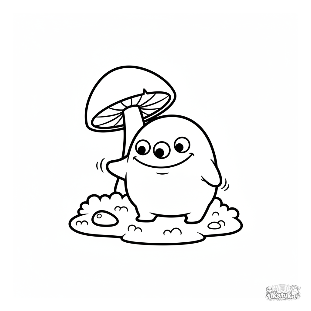 Ausmalbild für Kleinkinder: ein pelziges, freundliches Blob-Monster mit drei Augen bei einem Pilz. Einfache Formen und breite Ränder.