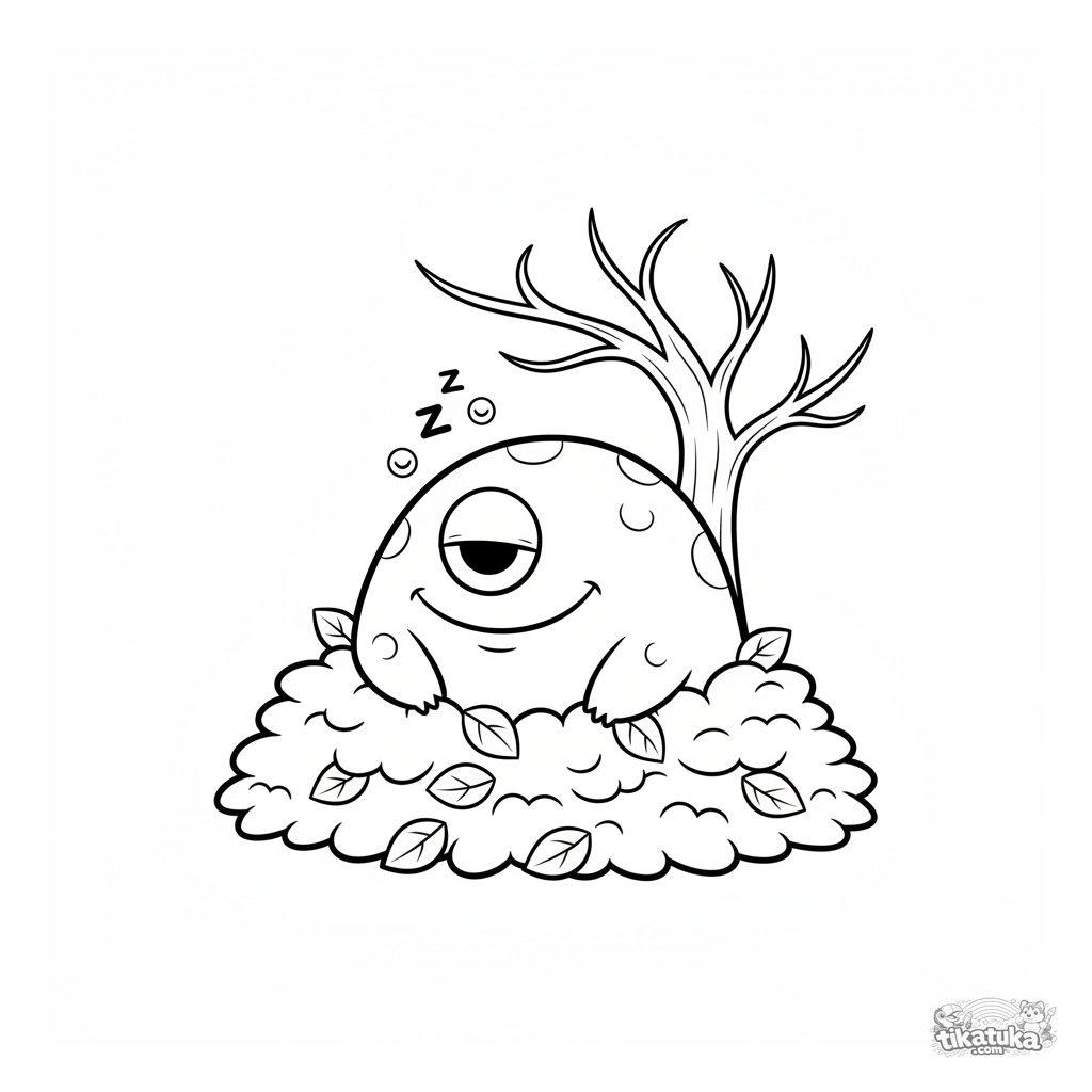 Ausmalbild für Kleinkinder 2-3: ein pelziges Einäugiges Monster schläft fest in einem Haufen Herbstlaub. Große geschlossene Formen, sehr einfache Linien, breite Ränder.