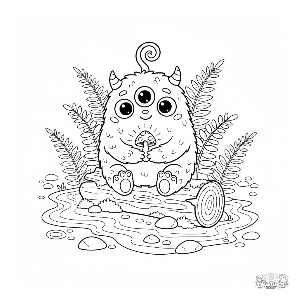 Ausmalbild eines freundlichen, pelzigen Drei-Augen-Monsters im Wald. Für Kinder von 4 bis 6 Jahren.