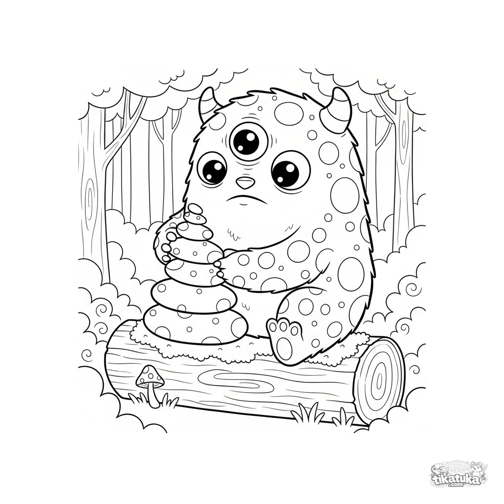 Ausmalbild eines freundlichen flauschigen Monsters im Wald. Für Kinder von 4-6 Jahren. Das Monster baut einen Steinturm neben einem leuchtenden Pilz.