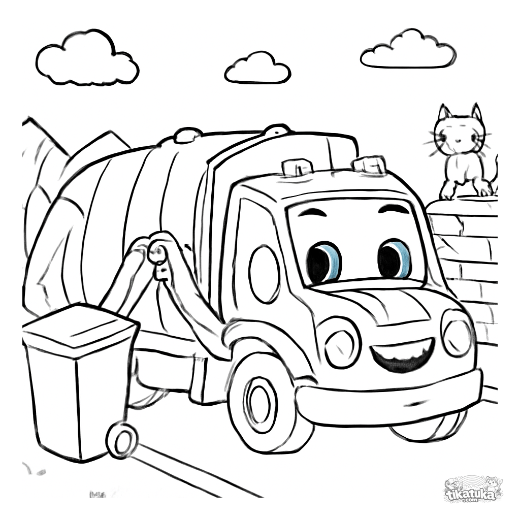 Ausmalbild eines freundlichen, lächelnden Müllwagens auf einer ruhigen Morgenstraße. Für Kinder von 3-6 Jahren. Einfache Szene mit Mülltonne und beobachtender Katze.