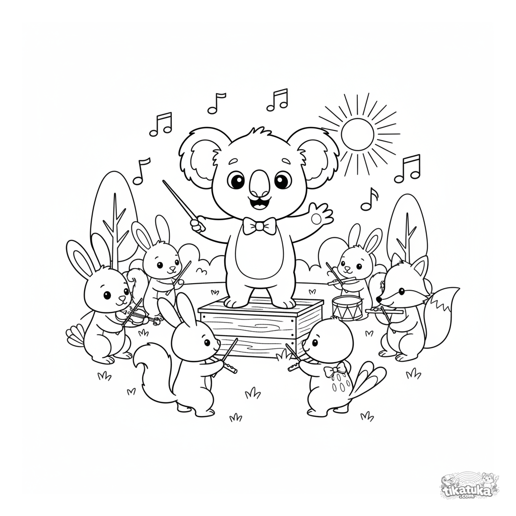 Ausmalbild für Kinder 4-6: Ein freundlicher Koala-Dirigent leitet ein Tierorchester auf einer Festivalwiese. Fröhliche Szene mit schwebenden Noten.