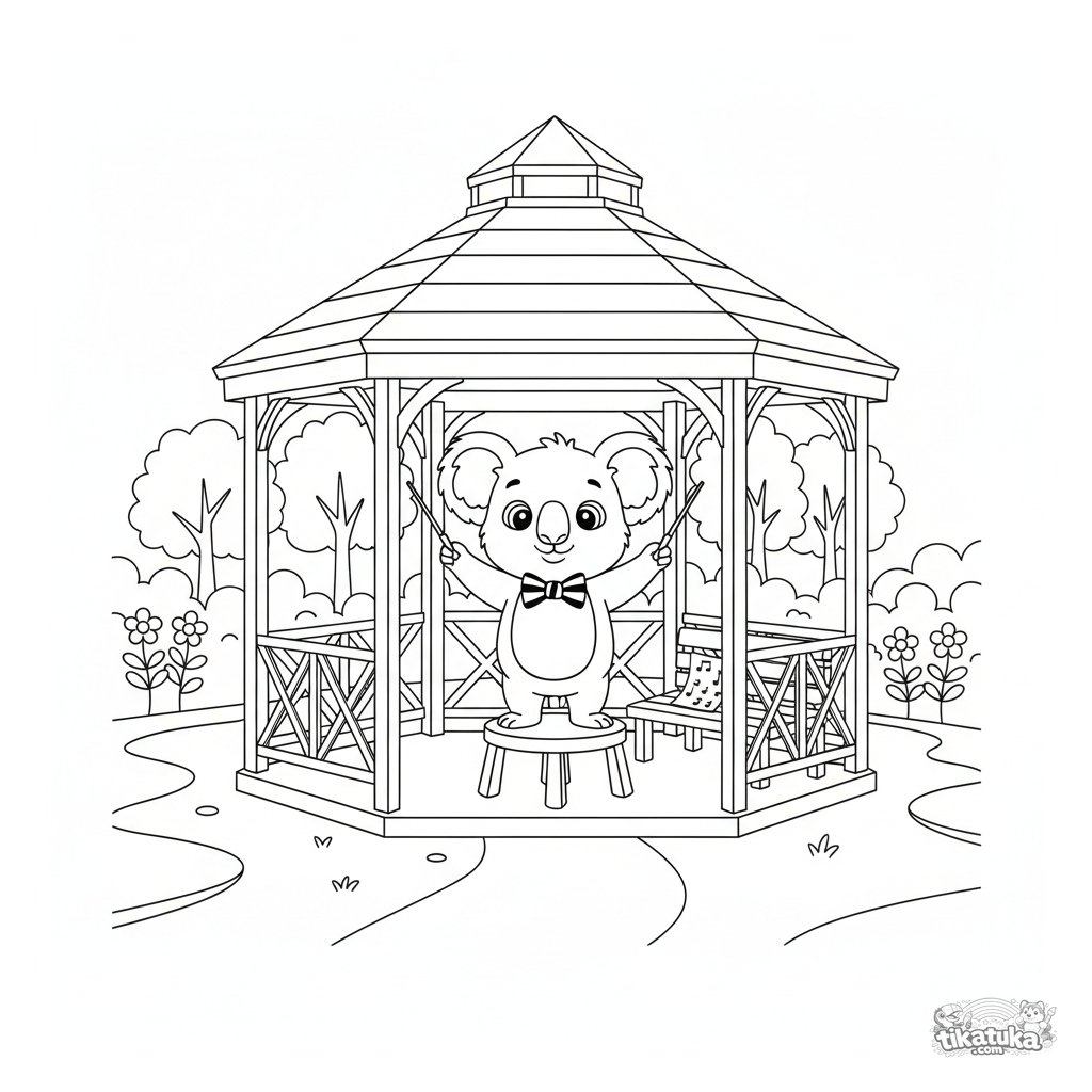 Ausmalbild für Kinder 4-6: ein freundlicher Koala-Dirigent in einem Park-Musikpavillon. Eine fröhliche Szene mit Notenblättern und einem Taktstock.