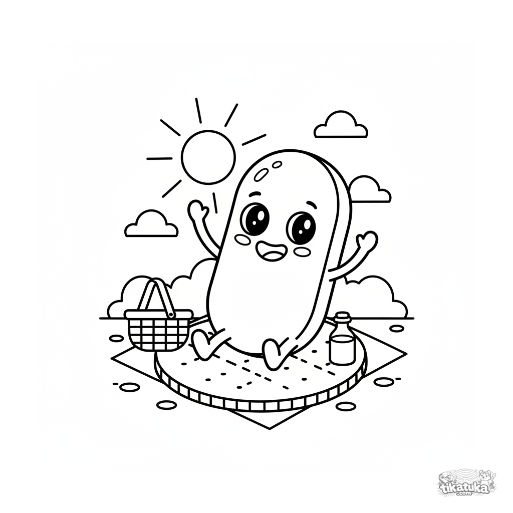 Einfaches Ausmalbild für Kleinkinder von 2-4 Jahren. Eine freundliche Cartoon-Mikrobe hat ein Picknick auf einem großen Cracker.