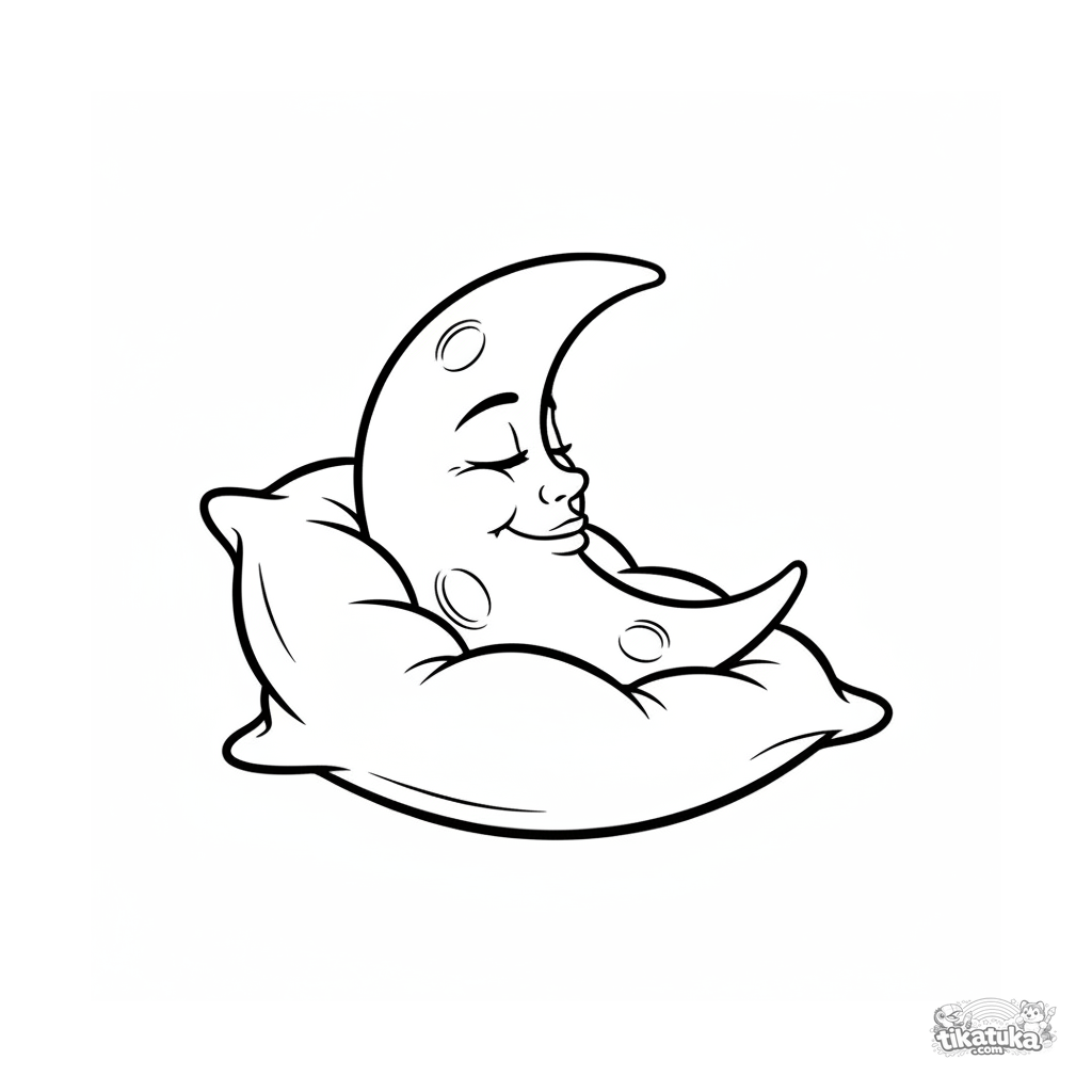 Ausmalbild für Kleinkinder: ein freundlicher, schläfriger Halbmond liegt auf der Seite auf einem Kissen. Weiche fließende Linien, friedlicher Ausdruck.