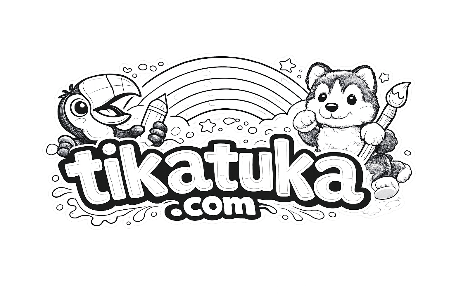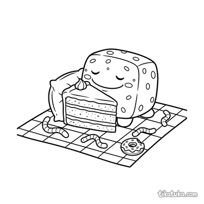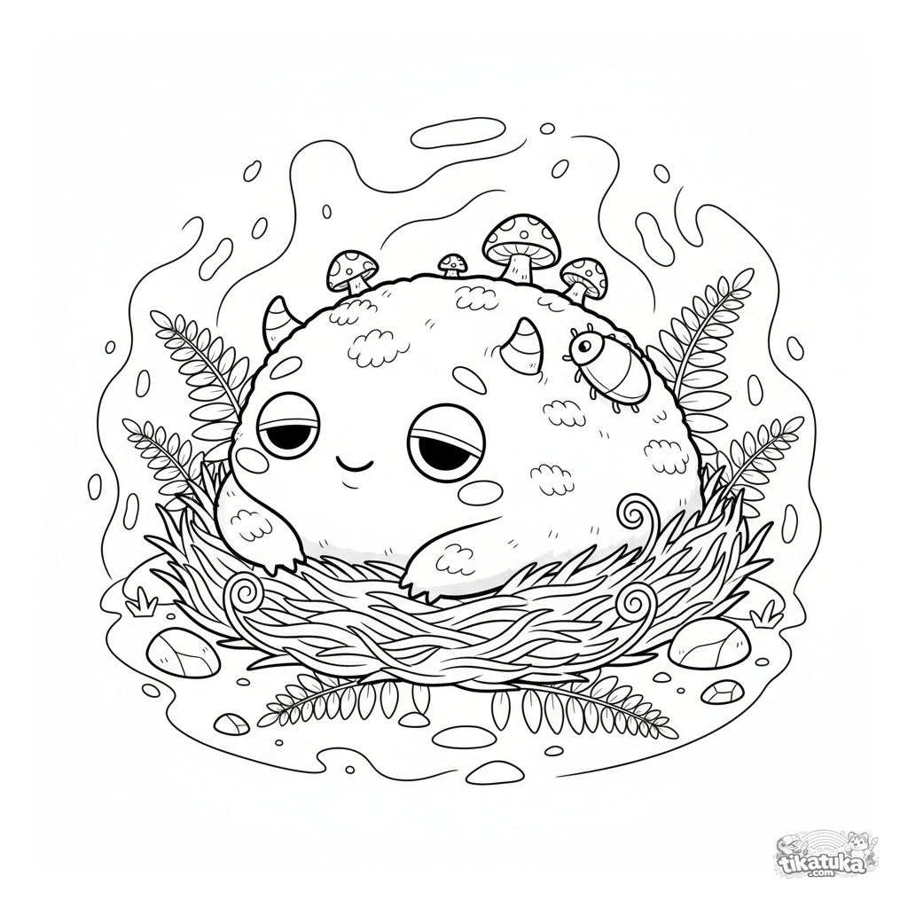 Ausmalbild für Kinder 4-6: ein freundliches Moos-Monster döst in einem Farnnest. Gemütliche Waldszene mit Pilzen und einem Käfer.