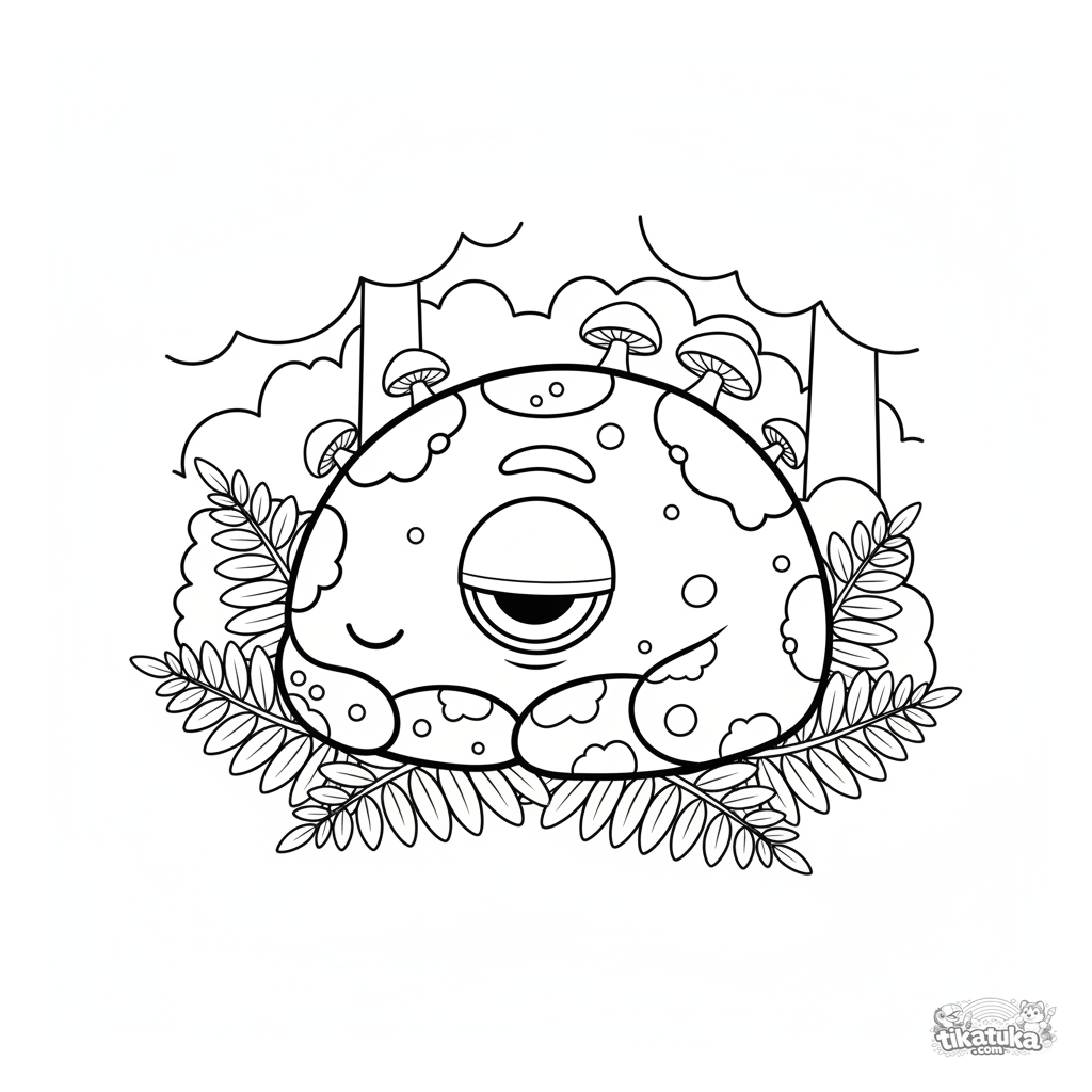 Ausmalbild für Kleinkinder: ein freundliches, moosiges Felsenmonster macht ein Nickerchen in einem Farnhain. Einfache, große Formen mit breiten Rändern.