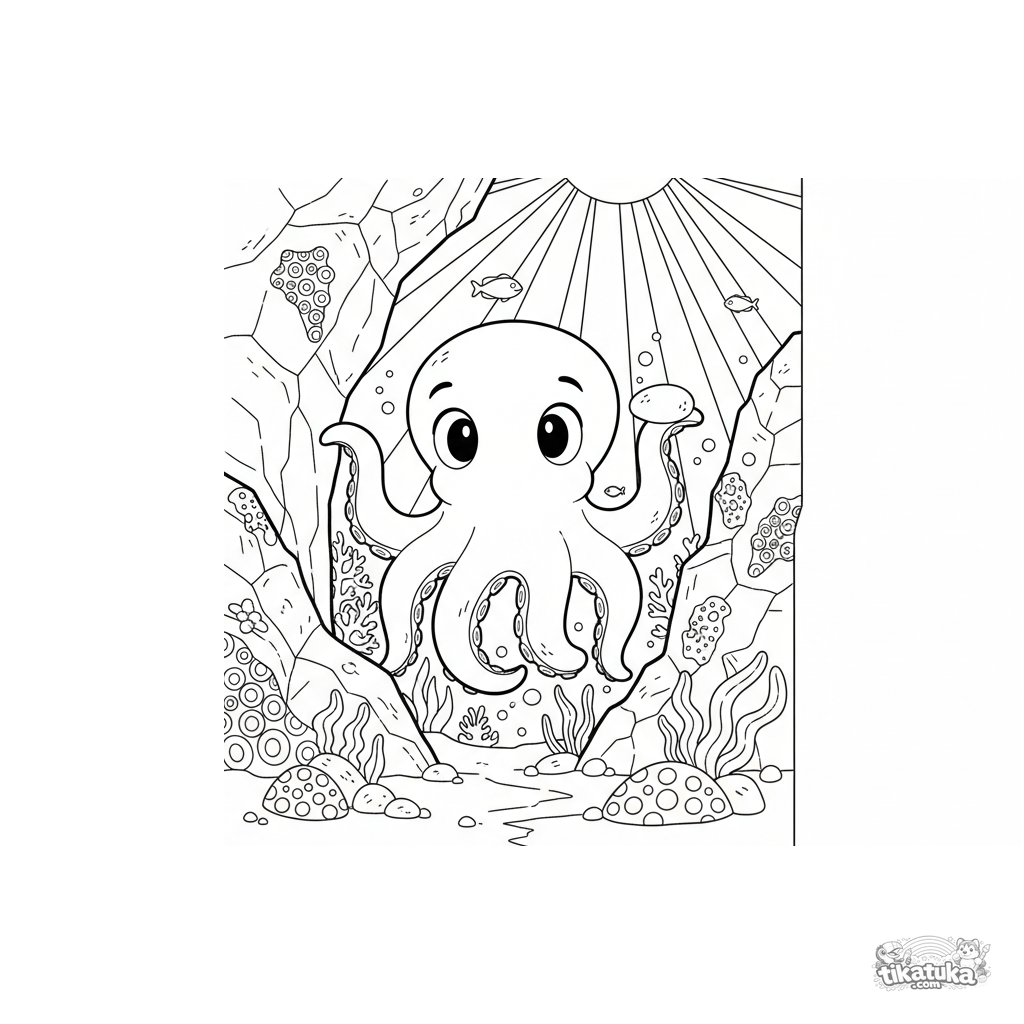 Ausmalbild eines fröhlichen Oktopus, der Verstecken zwischen Felsen im sonnigen flachen Wasser spielt. Für Kinder von 4 bis 6 Jahren.