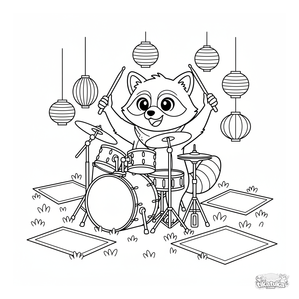 Ausmalbild für Kinder 4-6: ein fröhlicher Waschbär-Schlagzeuger spielt ein Schlagzeug auf einer Festival-Wiese. Einfache Formen und freundlicher Charakter.