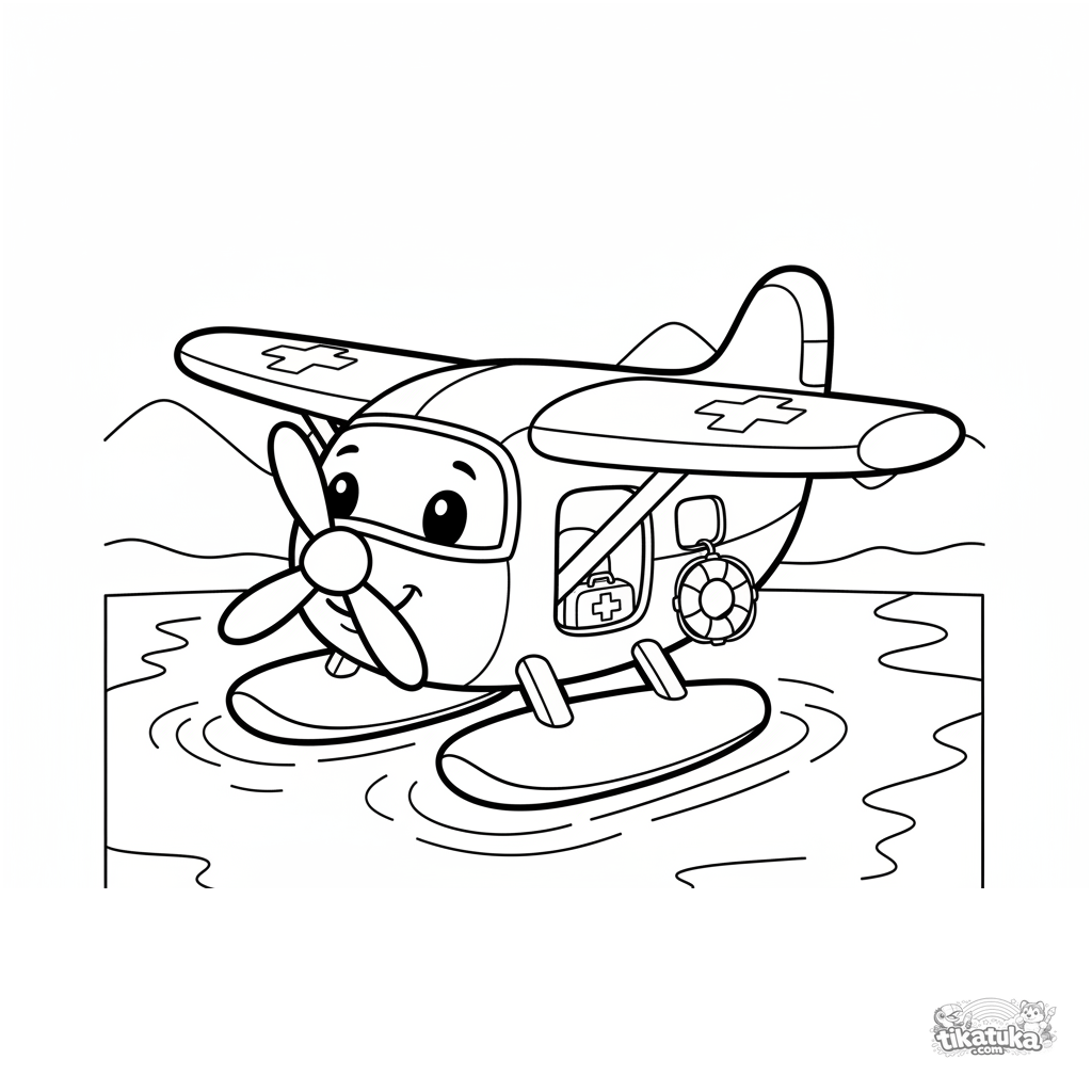 Einfaches Ausmalbild eines Seeflugzeugs für Kleinkinder 2-3. Ein freundliches Flugzeug mit lachenden Fensteraugen liegt auf einem ruhigen See.